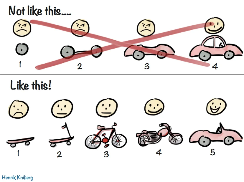 왜냐하면 결국 자동차가 출시되는 시점은 너무 늦을 것이고, 출시한 뒤에도 대부분의 사람들이 자동차를 원하는지조차 확신할 수 없습니다. 바퀴만 있는 상태에서는 아무도 그것을 사용할 수 없고, 따라서 피드백을 받을 수 없습니다. 6개월 후 완성된 자동차를 출시했는데 사람들이 원하는 것은 자전거였다면? 6개월이 낭비됩니다.