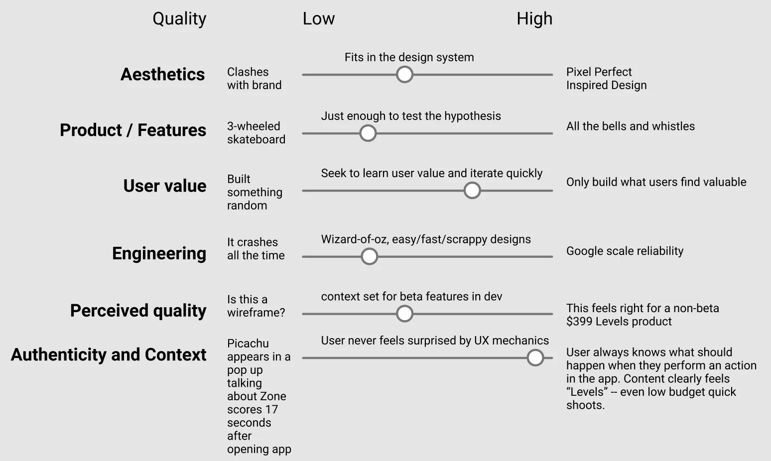 초기 제품팀의 경우 좋은 품질 기준에 대해 논의하기보다는, 제한된 리소스로 학습에 집중하는 것이 PMF를 찾는 저비용 고효율적인 방법이라고 생각합니다. 품질에 대한 논쟁은 시간을 소모하고 팀을 분열시킬 수 있습니다. "이 버튼의 색상이 맞나?", "이 애니메이션을 더 부드럽게 해야 하나?"와 같은 논의는 PMF를 찾기 전에는 시기상조입니다.