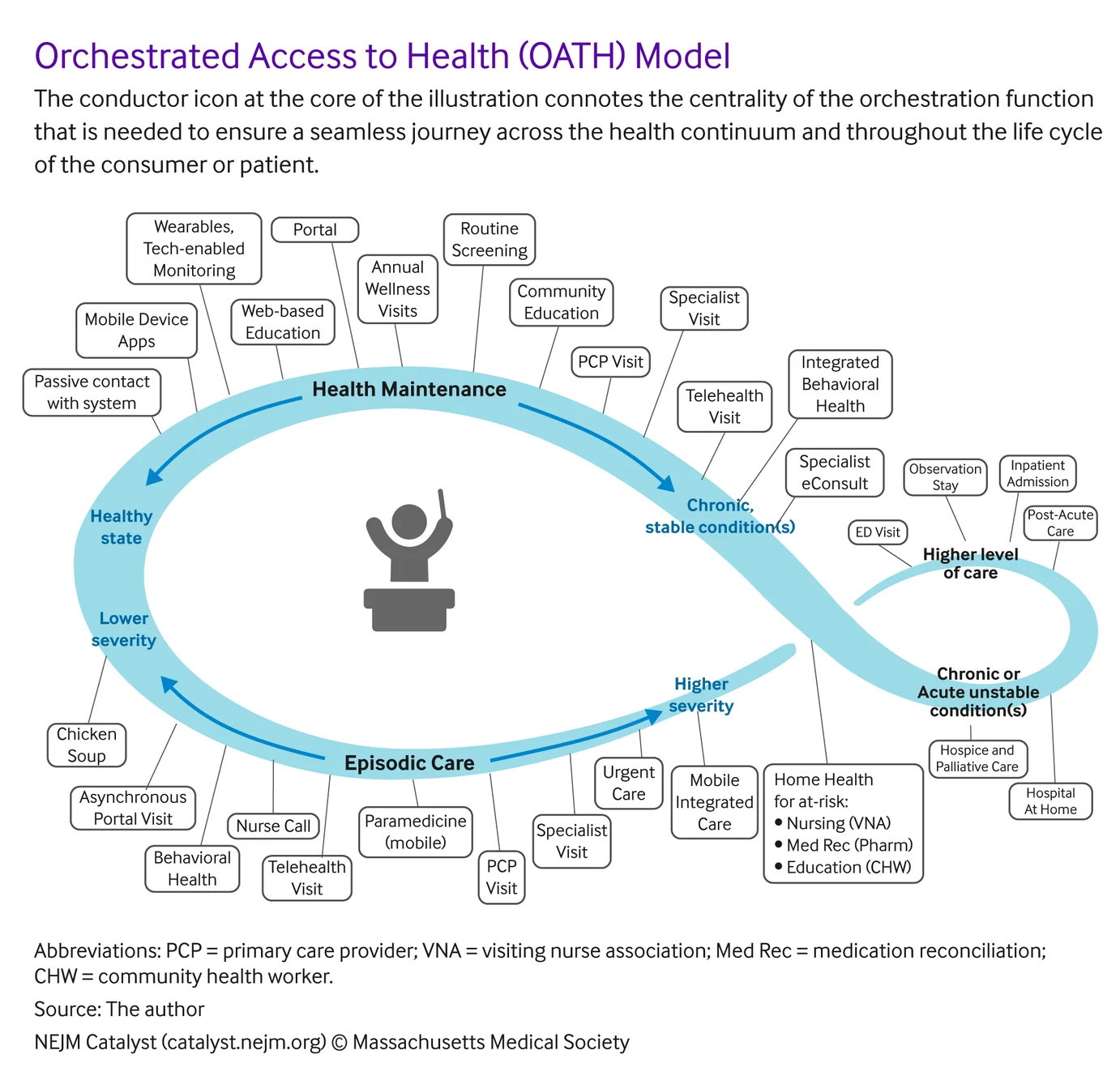 NEJM(The New England Journal of Medicine)에 흥미로운 논문이 출판되었습니다. 이 논문은 사람의 생애 주기 전반에서 건강을 관리하고 의료와 상호작용하는 지속적이고 순환적인 경로를 "오케스트레이션 모델"로 제안합니다. 마치 오케스트라가 여러 악기를 하나의 조화로운 음악으로 만들듯이, 다양한 의료 서비스를 통합하여 하나의 매끄러운 건강 여정을 만들자는 것입니다.